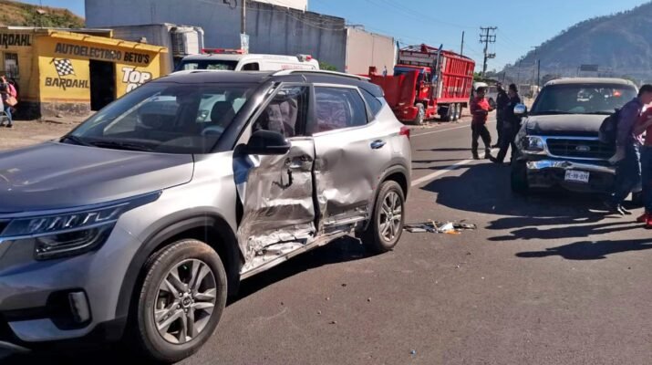 Por la carretera federal 15 libre, altura de los Lobos se registró un hecho de tránsito donde participa una camioneta de modelo reciente tipo Celtos, misma que colisiona al tratar de cruzar dicho tramo carretero contra por una camioneta tipo Lobo en color negro de uso como llantera móvil, arribando al lugar personal paramédico de la Cruz Roja quienes revisaron a los tripulantes resultandos lesionados una mujer y un hombre, personal de la Policía Estatal se encargó del reporte correspondiente del hecho de tránsito.