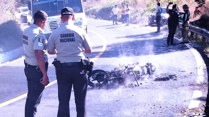 Fue reportado al número de emergencia 911 un accidente de motocicleta al impactarse contra un objeto fijo, barretera metálica e incendiándose sobre la carretera 200 Kilómetro 20+700 entre las localidades de Adolfo López Mateos y Emiliano Zapata de esa municipalidad, para posterior derrapar sobre la carretera y comenzando a incendiarse ambo, siendo auxiliado por un paramédico de la Cruz Roja de Valle de Banderas que pasaba por el lugar, para posterior el lesionado que fue llevado a un hospital a la Ciudad de Tepic para su atención médica correspondiente, al sufrir quemaduras en distintas partes del cuerpo, mientras que la moto se reportó pérdida total al ser calcinada, tratando de la marca Kawasaki moldeo 2017, de color negra, así mismo el lesionado de nombre Ismael ”N” elemento de la Guardia Nacional Carreteras, quien al parecer momento antes de los hechos pierde el control de la unidad al no respetar los límites de velocidad recomendados en las palmetas con los resultados ya mencionados.