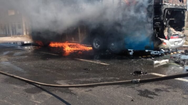 Personal de Protección Ciudadana y Bomberos, atienden siniestro en autobús en la Federal 15 autopista, Tepic – Villa Unión, como referencia en la caseta de Acaponeta.