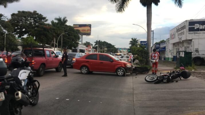 Por el bulevar Tepic Xalisco y calle Panamá de la colonia Los Fresnos, la mañana del jueves se reportó un choque al número de emergencia 911 donde participó una motocicleta y un automóvil tipo sedán, cuando momento antes circulaba por dicho bulevar en sentido al norte una motocicleta de la marca Honda tipo todo terreno, conducida por una persona del sexo masculino y al llegar al cruce con la calle Panamá le fue cortada la circulación “vial” por un vehículo de la marca Chevrolet de color rojo, que tratara de incorporarse a la calle el mención, proyectándolo contra el pavimento y resultando con golpes, mismo que fue atendido por personal de la Cruz Roja sin requerir su traslado a un hospital, en el lugar personal de la Secretaría de Movilidad agilizó la vialidad en la espera de la Policía Vial de Tepic quien se encargó del reporte correspondiente del hecho de tránsito.