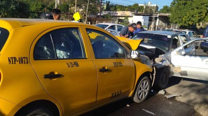 Por la avenida Aguamilpa altura con la avenida Uzueta entre el fraccionamiento Villas del Roble y Aramara en la zona de la Cantera Norte kilómetro marcado número 4, Cuando circulaba en sentido hacia el poblado de Mora, un taxi de color amarillo de la marca Nissan con número económico NTP10 73 y al llegar al lugar antes mencionado es chocado de frente por un automóvil tipo Pointer color gris, los cuales circulaban en sentido opuesto, cuando su conductor al parecer pierde el control invadiendo carril contrario y chocando de frente. “según fue cegado por los rayos del sol, lo que le provocó perder el control”, con los resultados ya mencionados- dónde 5 personas resultan lesionadas, tres adultos y dos menores de edad, entre los lesionados incluye el taxista, todos ellos atendidos por personal de la Unidad Médica Táctica de la PoliEstatal y por Bomberos del Estado.
