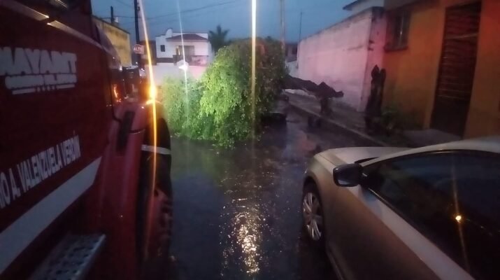 Atiende Bomberos de Nayarit, reporte de caída de árbol en calles de la colonia El Tecolote, esto a la altura del centro comercial Soriana en la ciudad de Tepic, esto derivado de las lluvias registradas está tarde.